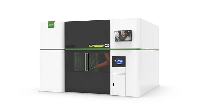 配置高軌跡精度的6軸機器人,確保切割精度;高剛性、高強度高 架龍門機架結構,確保穩定性;主機一體式結構設計,外觀美觀大 氣,操作便捷;可配置雙工位轉工作臺,或選配柔性工作臺;